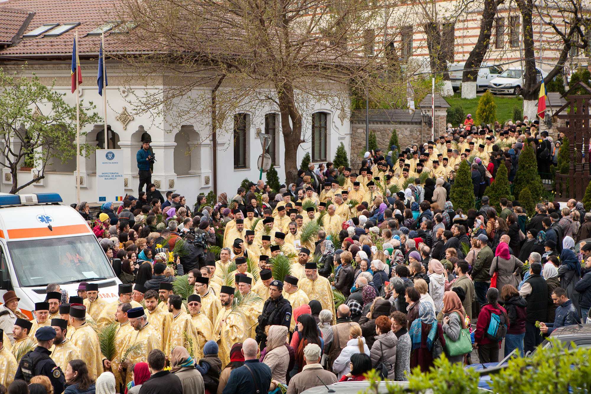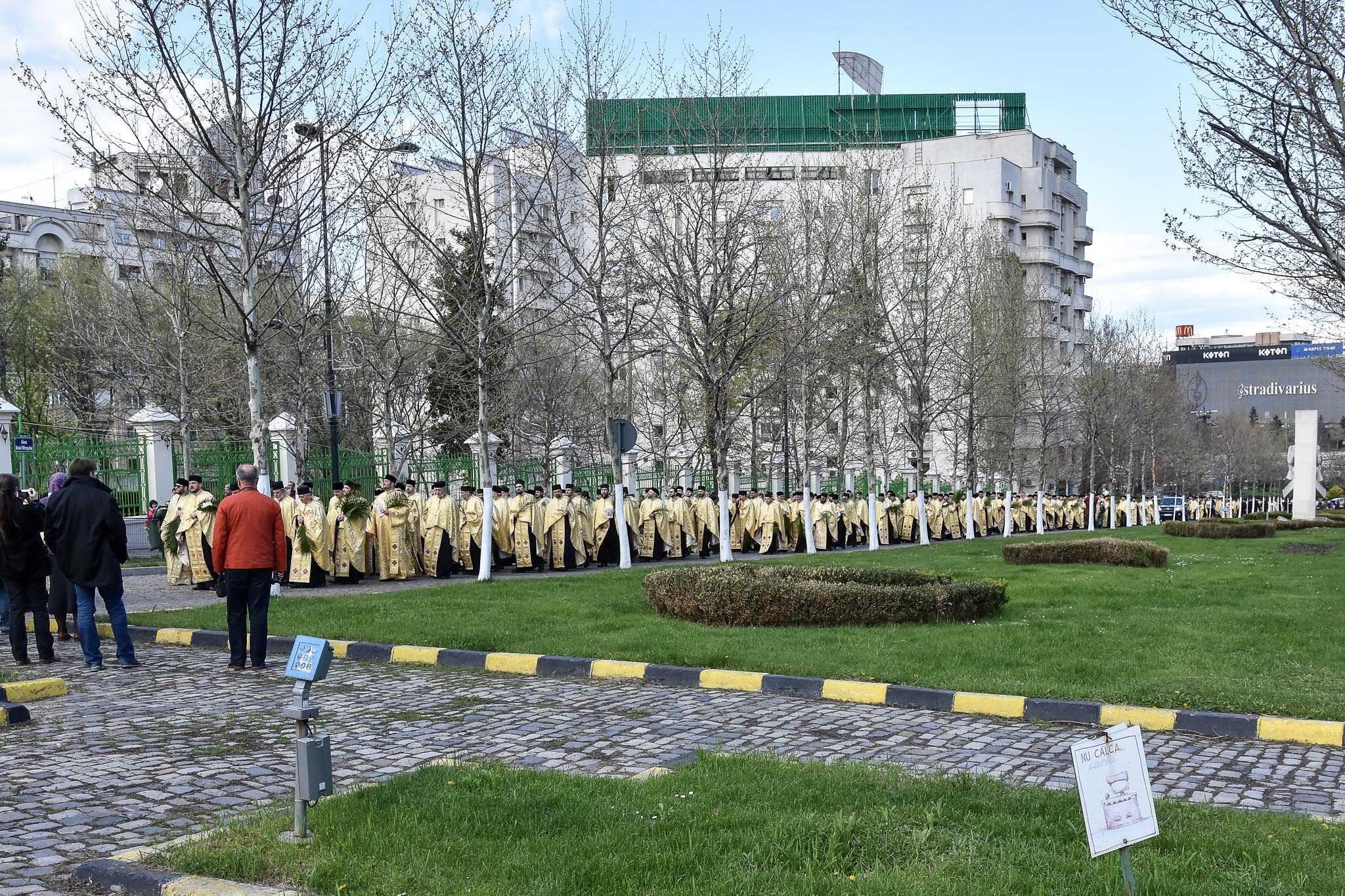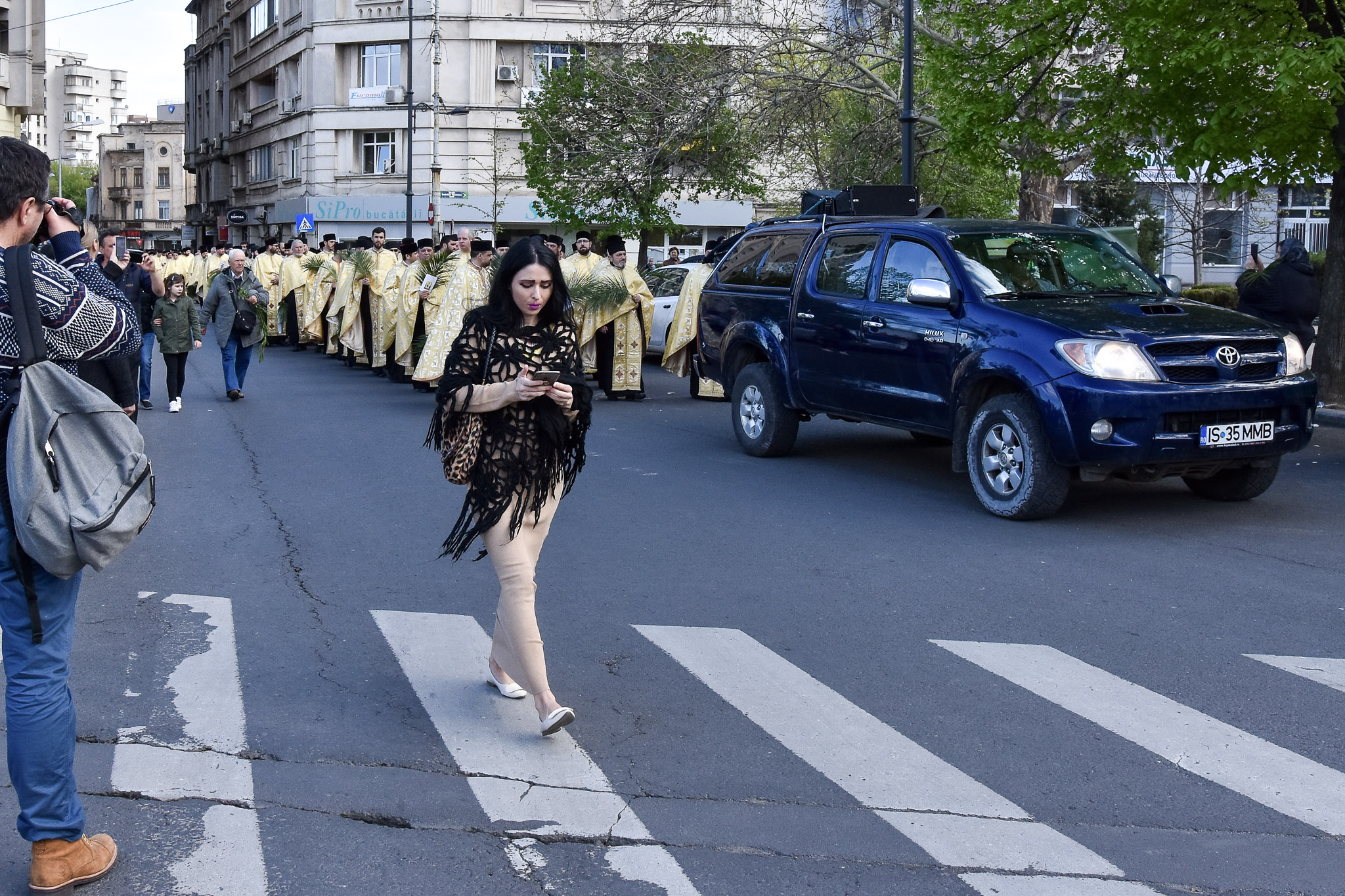 Marșul ăsta religios s-a învârtit între intersecția de la Budapesta și Patriarhie, cu un șir lung de preoți îmbrăcați în negru și galben, o mașină dotată cu difuzoare și ceva credincioși de pe margine care încercau să jongleze între făcut de cruci și filmat cu telefonul. A fost o slujbă din mers pe străzi mai mici sau mai mari din București și cu o oarecare încurcare a traficului. Din fericire pentru șoferi, bisericile la care avea nevoie șirul sunt între blocuri.