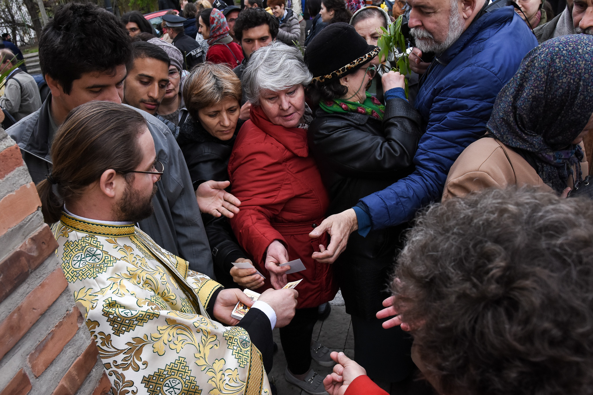 Distribuitorii de icoane s-au poziționat la ieșire din piață, spre zona de coborâre către Unirii. Aici erau câțiva preoți înconjurați de mulți oameni cu mâinile întinse.