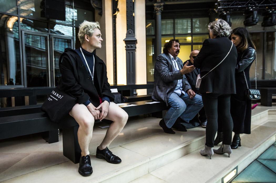Îl întreb nonșalant dacă știe încotro trebuie să mă-ndrept ca să ajung la săptămâna modei. Scoate o bucată mototolită de hârtie acoperită cu adrese mâzgălite. „Palais Brongniart.” Mă uit la harta lui de locuri, notez că mâine e Vivienne Westwood, înainte ca el să-și îndrepte brusc spatele. „Commes Des Garcons, Ambasada Rusiei!” Își atinge ceasul și-și deschide geanta de umăr, permițându-mi să văd cu coada ochiului un costum de Vladimir Lenin: „Trebuie să mă schimb!”