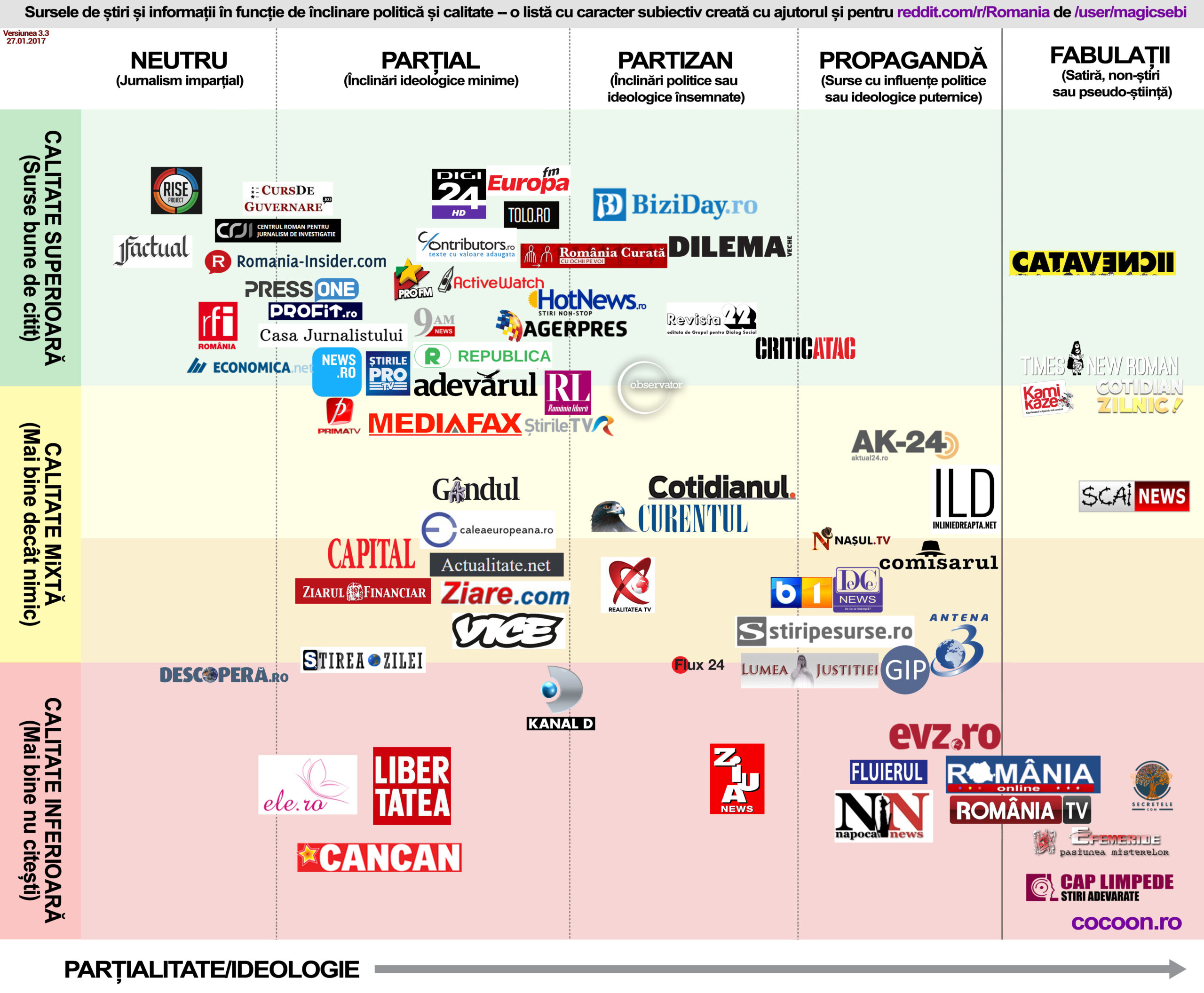 M-am tot uitat pe harta asta ca să văd unde și cum sunt puse publicații mari. Între neutru și fabulație și calitate superioară și inferioară, găsești cam cele mai populare. Lipsesc câteva nume, cum ar fi Decât o revistă, Ring (ziar și site), Click!, Gazeta sporturilor (care a publicat anchete bune pe lângă restul conținutului), Wall Street (care e mai pe business, dar a făcut și livetext de la protest) și lipsesc site-urile televiziunilor (care sunt mai mult sau mai puțin diferite de TV).