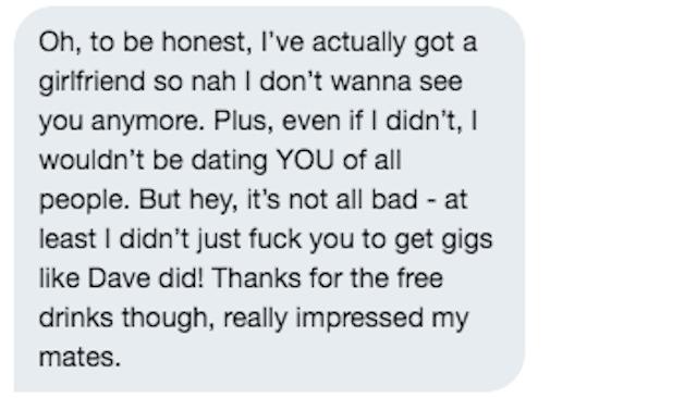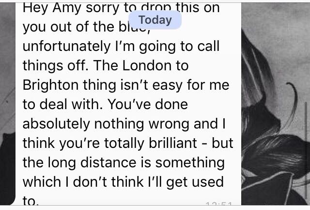Explicație: „El s-a băgat în seamă pe Instagram și după ce-am vorbit o vreme, am ieșit la o întâlnire. Am continuat să ne vedem vreo două luni. L-am întrebat dacă-l deranja naveta Londra-Brighton și mi-a spus că nu. El lucrează în Londra în fiecare miercuri, dar când l-am întrebat o dată dacă vrea să iasă la o bere după muncă, mi-a spus: «Trebuie să fug acasă să trag de fiare.» Apoi l-am întrebat dacă vrea să ne vedem în weekend și mi-a spus să vin următorul weekend că are loc «o masă importantă». A doua zi am primit mesajul ăsta. I-am răspuns de abia după o zi, pentru că eram prea supărată, iar după ce i-am scris, nu m-a mai contactat deloc.”