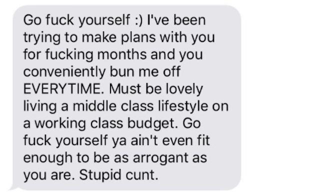 Ăsta e un mesaj de băgare în seamă la 2 dimineața, urmat de altul la 3, apoi încă unul la 9 în care-și cere scuze pentru cele anterioare, iar pe seară se încheie cu un ultim mesaj de „Du-te-n pula mea, curvo”.