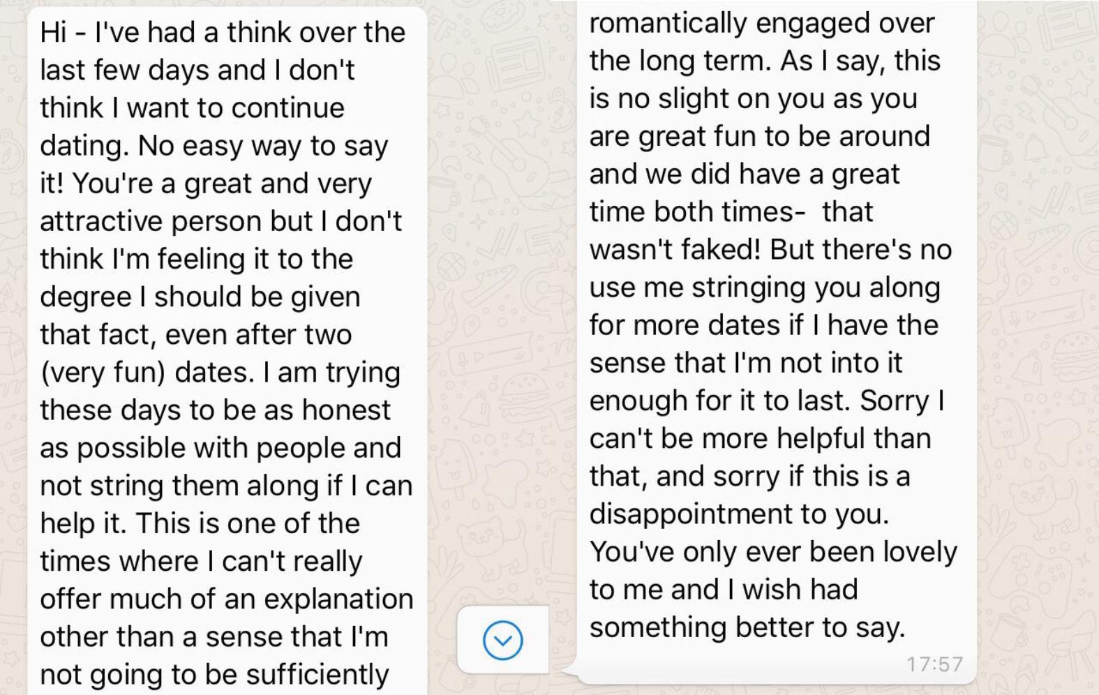 Evident, limbajul mesajelor de despărțire sunt mereu codate, pentru a nu răni sentimentele oamenilor: „scuze că-ți dau papucii din senin”, înseamnă „da, te evit de ceva timp”, iar „nu cred că pot să fac față” înseamnă „nu vreau.” Intențiile tipului au fost OK, dar din păcate omul ăsta nu s-a sinchisit să depună vreun efort. Ca rezultat, ăsta e doar un mesaj presărat cu câteva cuvinte pozitive, ca să nu-ți zică direct în față: „nu te plac suficient cât să trec peste drumurile cu transportul în comun, mai lungi de 45 de minute.”