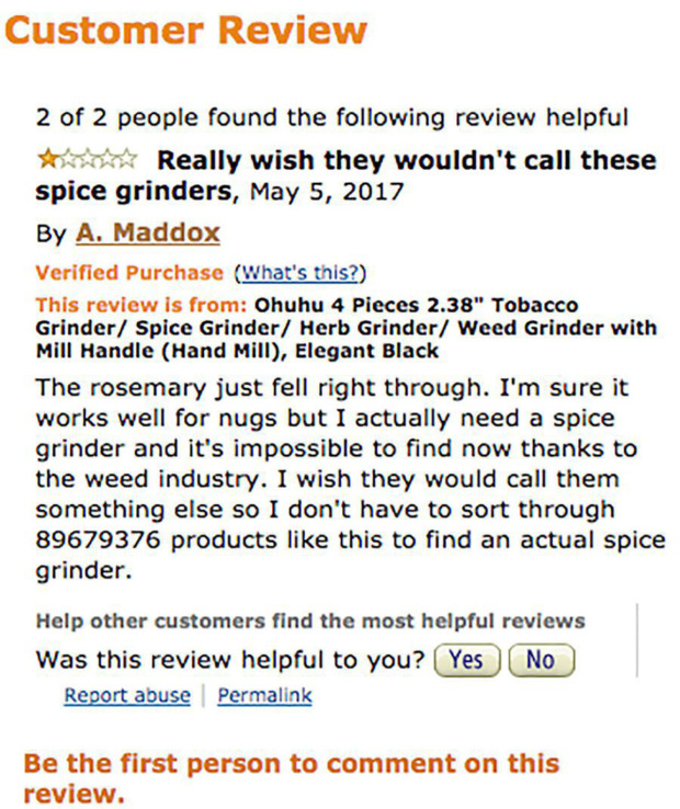 La fel ca utilizatorul de pe Amazon, A. Maddox a renunțat la căutările ei după un grinder de ierburi aromatice și s-a mulțumit cu un grinder de iarbă. Odată cu răspândirea lentă, dar sigură a legalizării canabisului prin America, și mult mai lentă prin Canada, vânzările de accesorii pentru iarbă au crescut. Ca rezultat, până și bătrânul Amazon vinde grindere pentru iarbă. A ajuns peste tot și e din ce în ce mai greu să găsești unul normal, din ăla pentru ierburi non-psihoactive.
