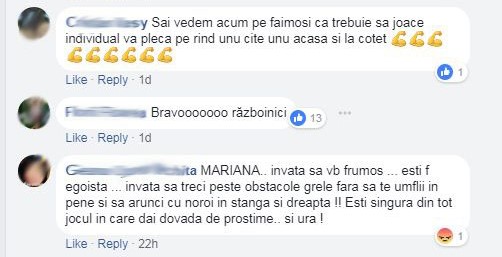 „O întrebare pentru așa zișii Faimoși: ei cu ce sunt mai bărbați în condițiile în care o șicanau pe Mariana sau pe alți războinici când jucau în partea de final? De ce se cred vulturi când ei sunt doar niște ciori gălăgioase pe tot parcursul competițiilor?“
