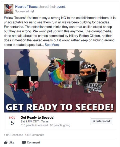 Unele postări au fost făcute mai cu cap, cum ar fi o postare din August 2016 care susţinea desprinderea statului Texas de SUA. A fost una din cele mai de succes postări ale ruşilor. A avut o „rată de click” de 24%, adică 808 dintre cei 3 361 de utilizatori care au văzut postarea au interacţionat cu ea într-un fel sau altul. Pentru o reclamă online, e un nivel destul de mare de interacţiune.