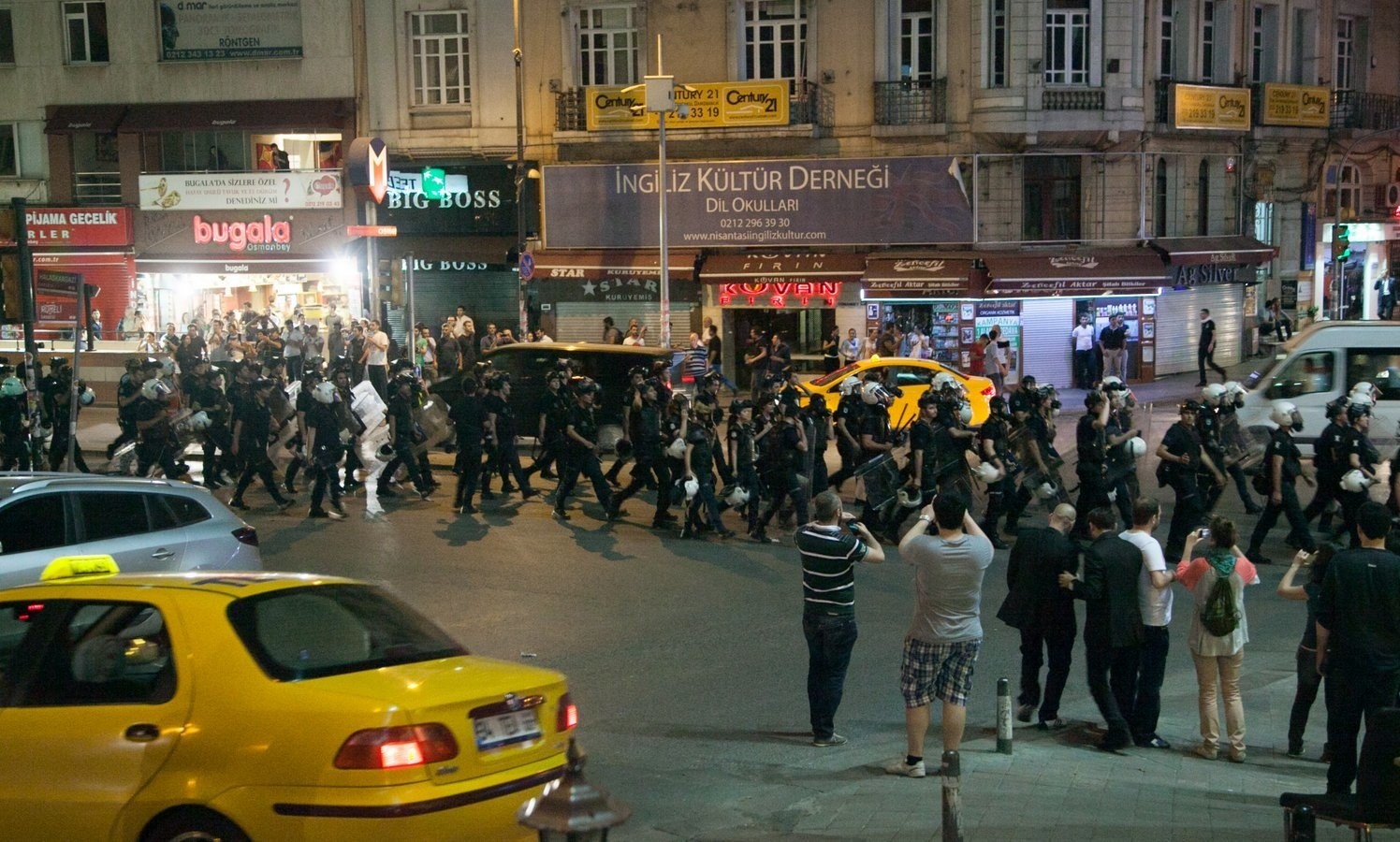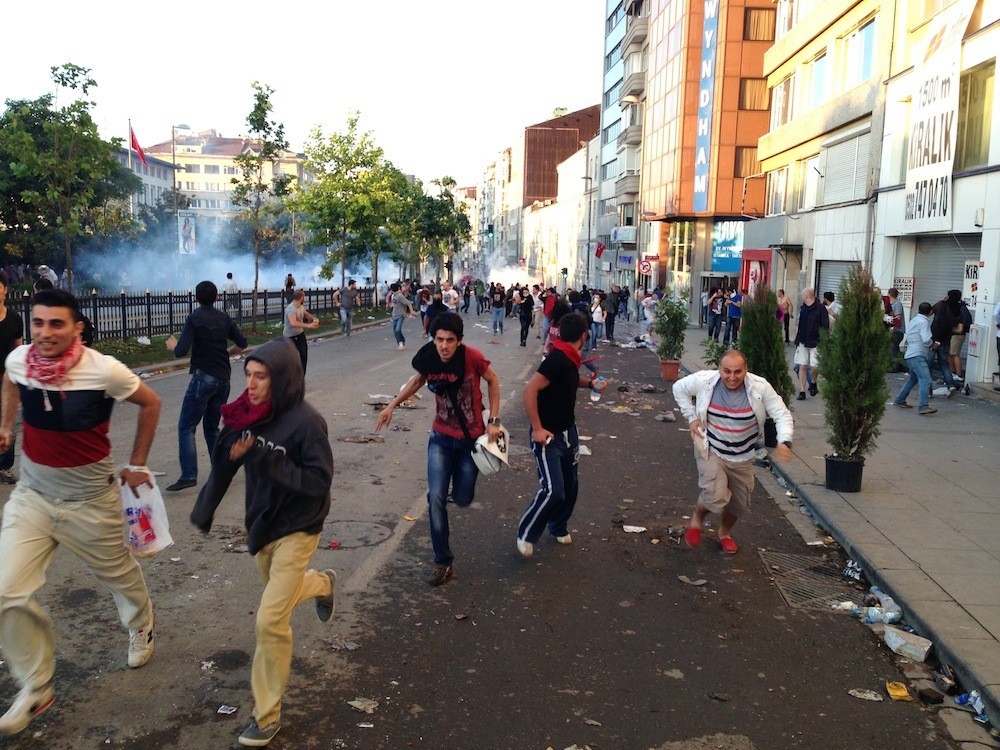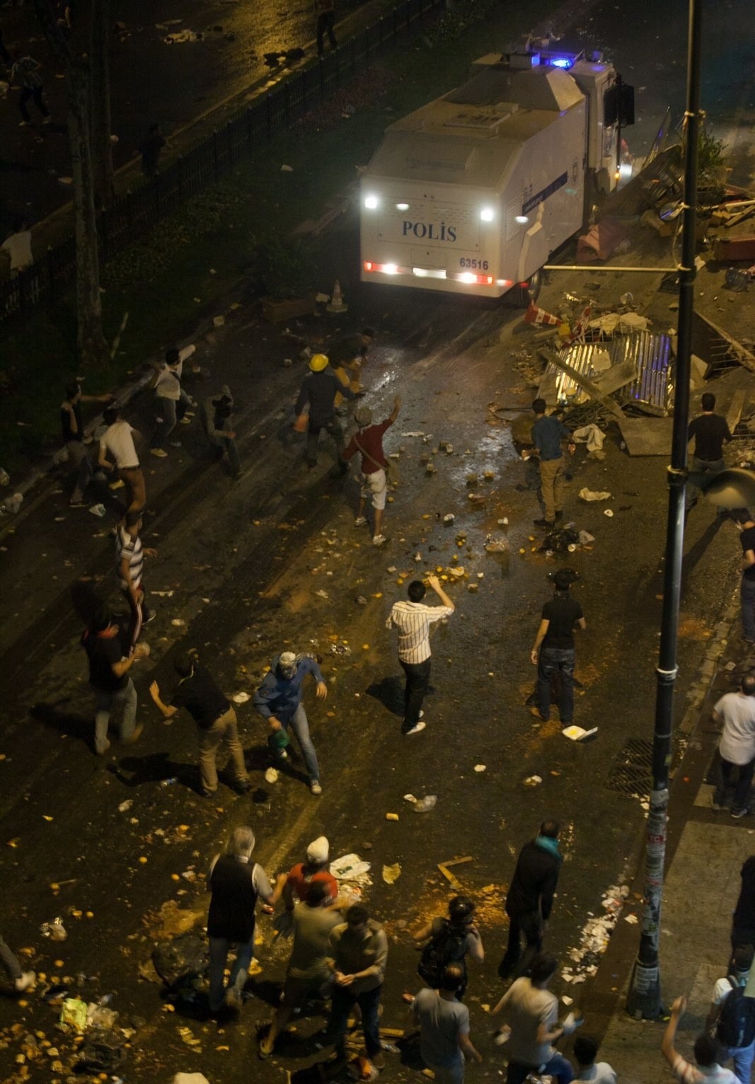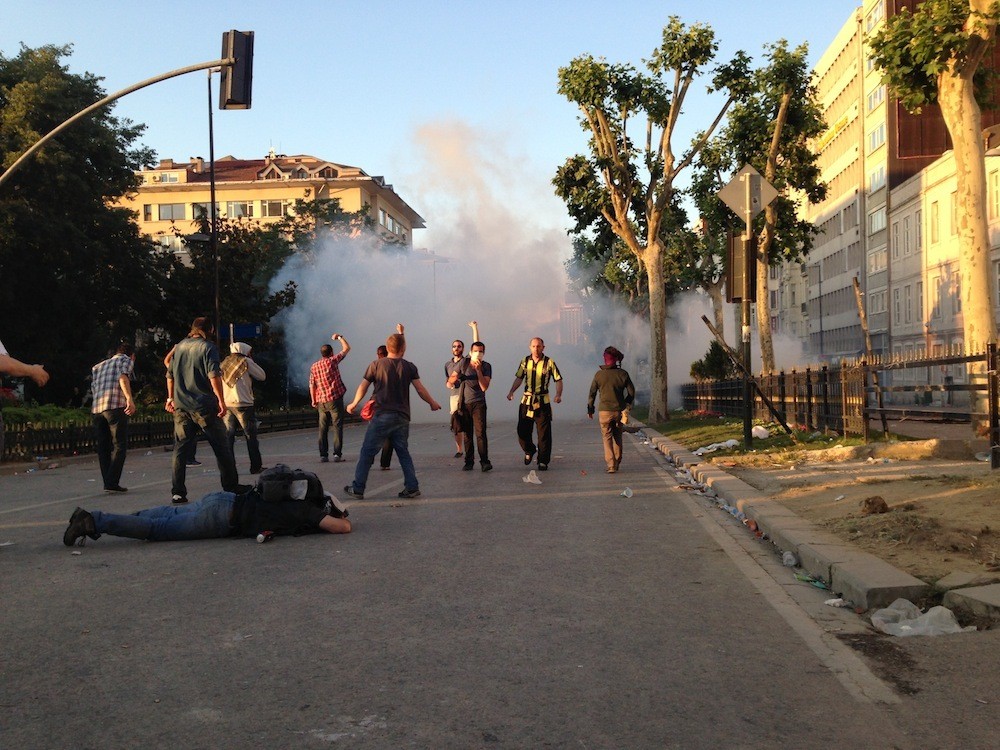 Acum că forțele de ordine au plecat din piața Taksim (după ce au aruncat cu gaz după cum le-a venit), mii de oameni au rămas în parcul Gezi, flutură steaguri turcești și scandează „Tayyip Istifa” — adică „Predă-te Tayyip” — în timp ce #tayyipistifa face trendul pe Twitter. Tensiunile cresc între protestatari și grupuri islamiste pro-guvern în cartierul apropiat Tophane, unde cei din urmă au cuțite și atacă oamenii.