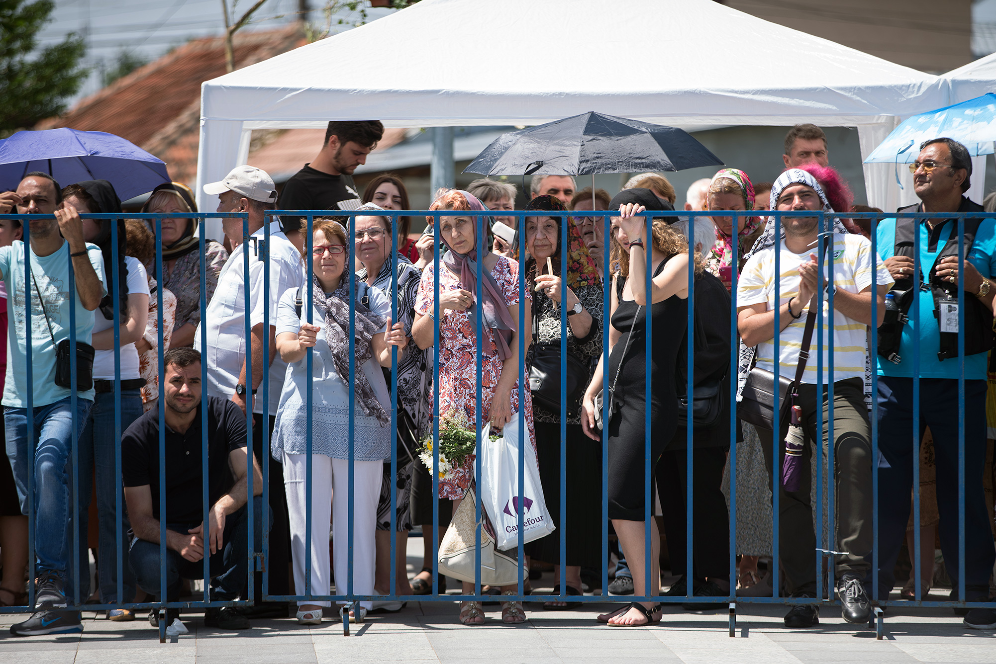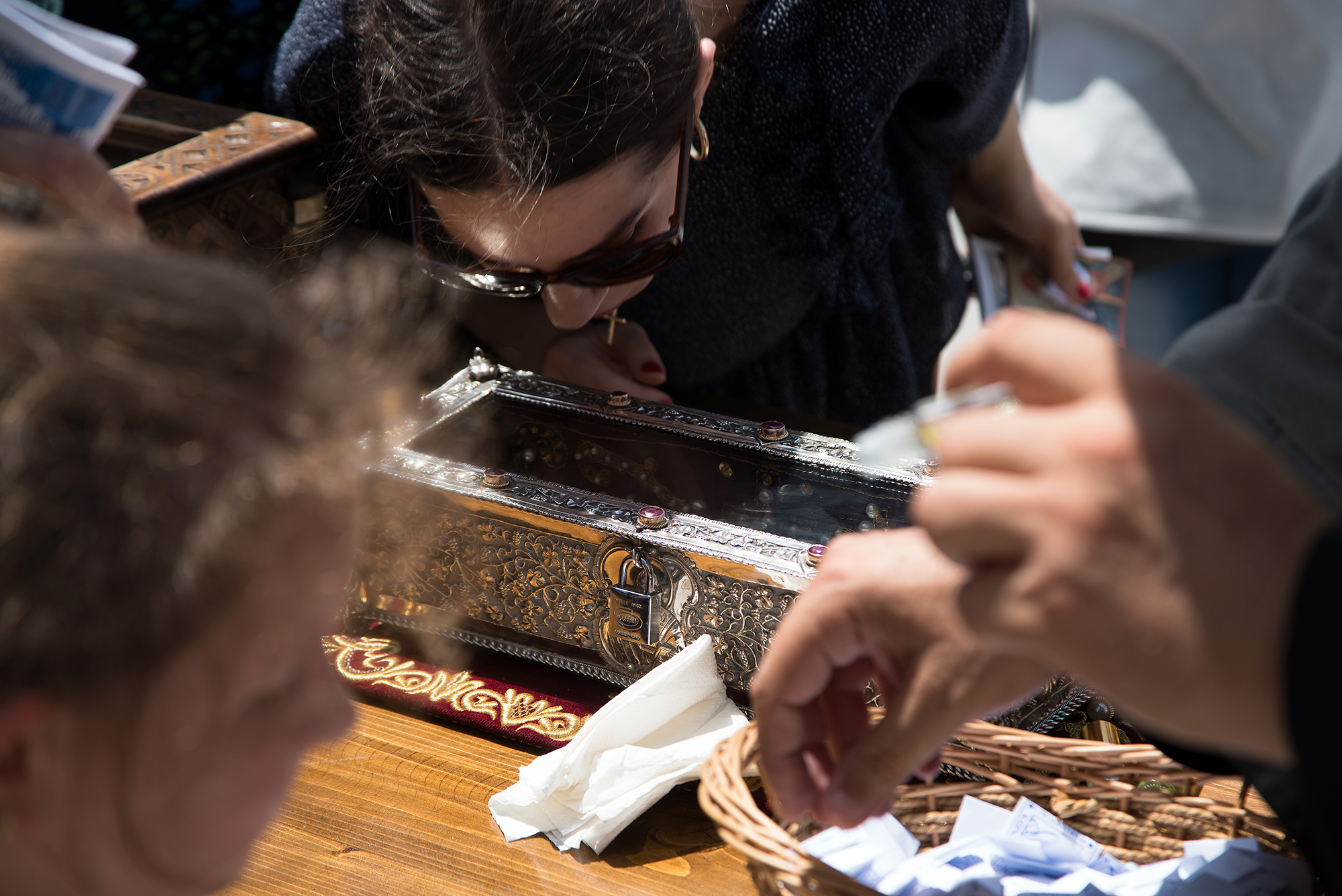 Cam cinci ore au stat duminică la coadă oamenii să ajungă la moaște. E adevărat, spun ei, ceremonia a fost întreruptă de liturghie și de discursuri, altfel se stă mai puțin. Incidente nu sunt, coada e civilizată, organizată, nimeni nu se împinge, lucrurile sunt clar delimitate. O doamnă în vârstă, la gardul din față, îmi spune cum a venit de la ora șapte, dar nu s-a așezat la coadă. „Mă bag pe aici, aștept niște cunoscute.”
