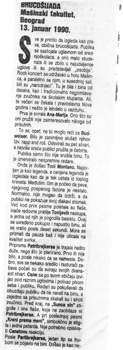 Cera se prisećao toga: „Na spratu u nekoj svlačionici dok smo čekali da izađemo na binu sedele su tu sve grupe. Ja sam pio pivo. A ja sam odrastao slušajući Šarla Akrobatu i EKV. Te devedesete sam video Vda koji je bio moj idol. Prolazio je od svakog do svakog i držao neku flašu od litar. Ali kako je sa kime razgovarao tako ga je pitao da mu sipa malo toga što pije u tu flašu. I on je tako išao sa tom flašom u kojoj je bilo bog zna kojeg sve pića pomešanog u jedno. A ja kako mi se to smučilo, a ucirkao sam se, otišao sam u wc da povraćam. U međuvremenu su ovi otišli na binu i postavili se. U tom trenutku sam čuo Dušana koji je uzeo mikrofon i počeo da me doziva: ‘Gde je ovaj Cera bubnjar, pizda mu matrina! Hajde silazi dole!’ A ja povraćam, nije mi dobro. U nekom trenutku sam sišao, seo, a dole puno ko’ oko. I mi krenemo: jedan, dva tri i — udri! U tom trenutku je počela takva ludnica da je cela bina počela da se trese, zvučnici su krenuli da se pomeraju, mi smo počeli pivima da prskamo po publici, a dole opšta šutka. Organizator je morao da dođe i da prekine koncert nakon prve pesme.“