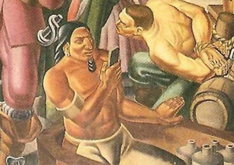 Ali mural „Gospodin Pinčon i naseljavanje Springfilda“ je iz doba Nju Dila, sedam decenija stariji od ajfona. Italijanski poluapstraktni umetnik Umberto Romano uradio ga je još 1937. „Naseljavanje“ prikazuje stvarne događaje iz predratnog vremena – susret dva plemena iz područja današnje Nove Engleske (Pokumtuk i Nipmuk) sa engleskim doseljenicima u selu Agavamu, u današnjem Masačusetsu. Ovaj susret dogodio se oko 1630., bar dva veka pre elektriciteta.