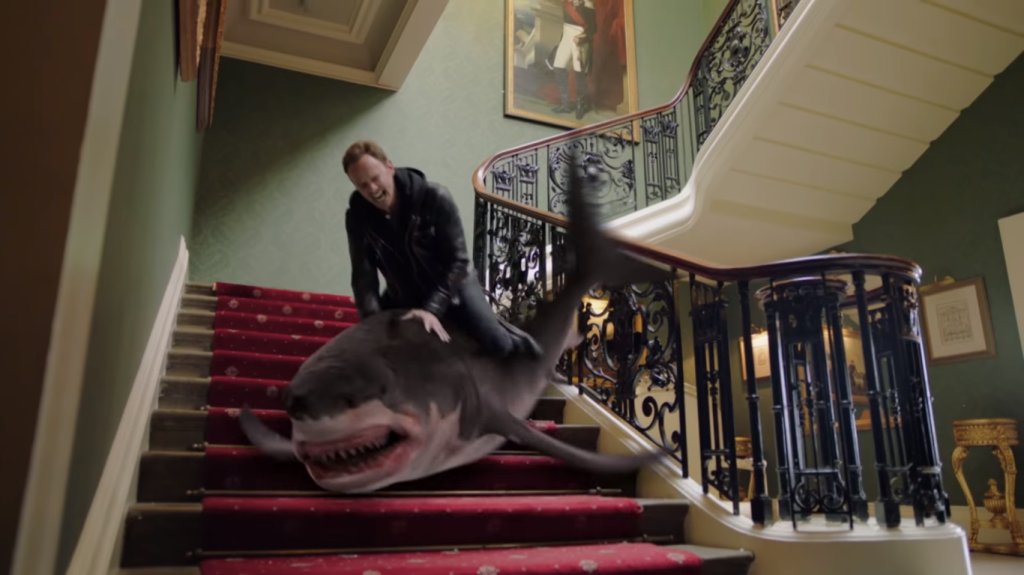 U pitanju je mešavina Indijane Džounsa, Džejmsa Bonda i denbraunovske jurnjave za istorijskim artefaktima koji se tiču ajkula. Ali ovo je bukvalno mešavina, zato što Fin Šepard (Jan Zering) pronalazi Indijev šešir i bič u nekakvoj pećini kod Stounhendža koja krije tajnu boga ajkula. Za to vreme ga njegova porodica čeka u štabu MI6 gde nekakava jeftinija verzija Q-a demonstrira hemijsku olovku iz koje može da se puca. Na ajkule, naravno.
