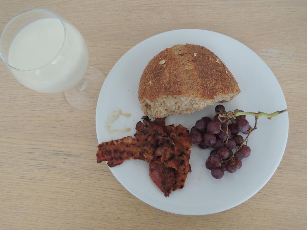 Čini se da niko u Igri prestola nije vegetarijanac, tako da sam se mentalno pripremila za to da ću čitav dan jesti meso. Deset je izjutra. Normalno bi to podrazumevalo jogurt sa komadićima banane ili kuvano jaje, ali se današnji jelovnik sastoji od tvrdih komada usoljenog mesa i izvrsnog hleba. Hleb kidam rukama, a mleko pijem kao prava divljanka. Nisam pomuzla kravu da bih došla do njega, ali to zaista deluje grubo u kombinaciji s ostatkom mog doručka. Osećam se spremnom da se hrabro uhvatim u koštac sa zmajevima i drugim čudovištima, zato što je ovaj doručak baš jak. Naročito slanina koju sam ispržila uz pomoć Divlje vatre (ili, znate već, svog šporeta).
