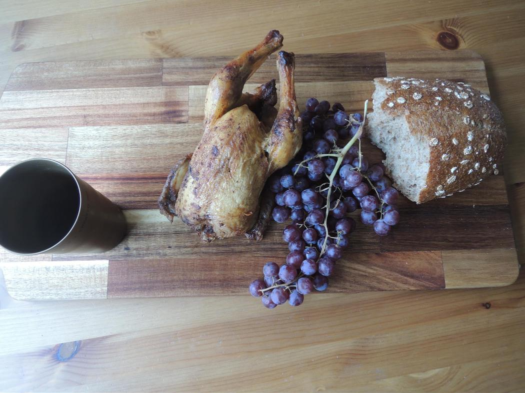 Ovo jelo spada među moje najbolje radove, iako lično ništa nisam uradila kako bih ga spremila (kupila sam unapred spremljeno pile). Mikrotalasnih nema u Sedam kraljevstava, tako da nisam mogla da podgrejem lazanju. Ovo celo pečeno pile sa hlebom i grožđem izgleda kao da je stiglo pravo iz nekog zamka iz Igre prestola. Živina je izvrsna, grožđe izdašno i ja samo nastavljam da se nalivam vinom i pivom. Ne osećam se posebno uglađeno dok kidam komade piletine zubima, ali već sam zaključila da bih, u svetu Igre prestola, ionako verovatno pripadala najistaknutijoj porodici. Štaviše, Vesteros mi ne deluje kao mesto za uredno isečena pileća prsa. Jedini bedak je što se ne ložim posebno na glabanje kostiju.