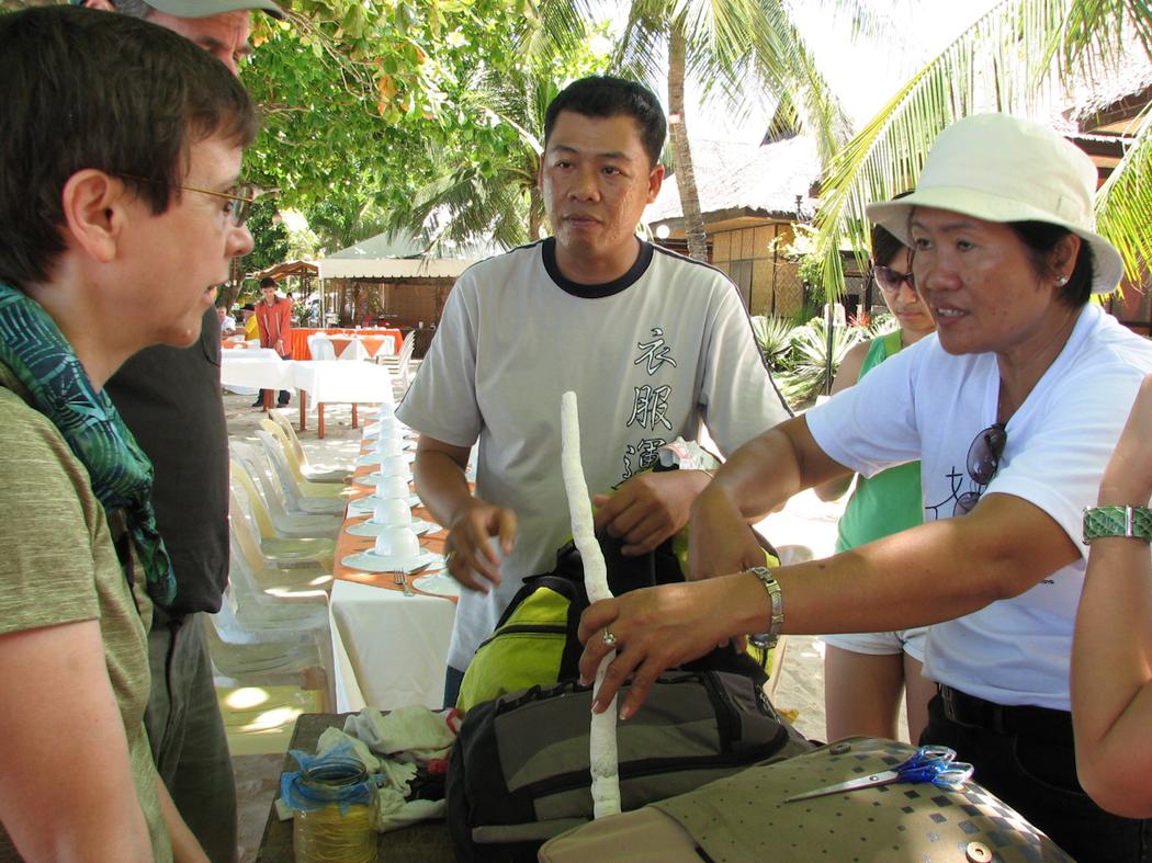 Margo Hejgud govori o ljuskama brodskog crva sa Randeom Dešavezom i Džulijom Albano sa Državnog univerziteta Sultan Kudarat. Slika: Marvin Altamia