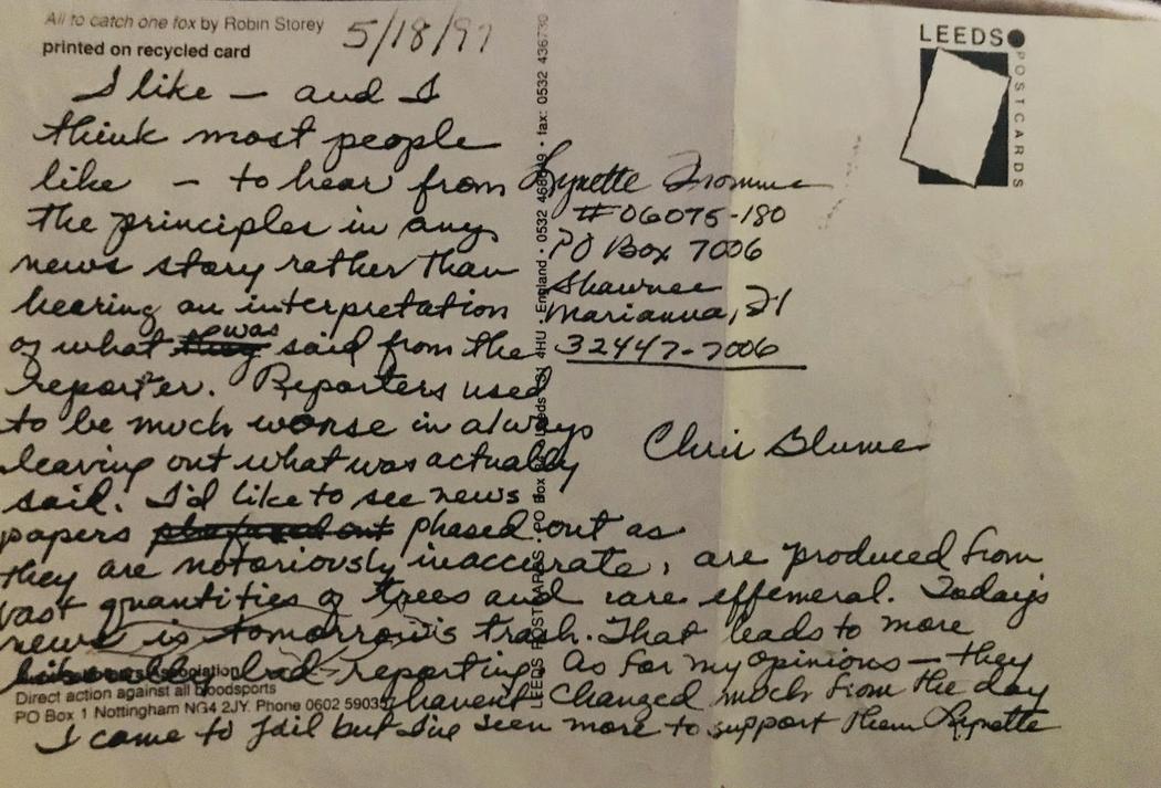 Iste godine, 1988. Radio sam u knjižari, neko je pitao da li imamo The Garbage People, knjigu Džona Gilmora i Rona Kenera o Mensonu. Od tog kupca sam dobio adrese zatvora u kojima su robijali. Svima sam pisao – Patriši Krenvinkel, Lesli Van Houten, Linet From, i Čarliju. Samo on i Linet su mi odgovorili.