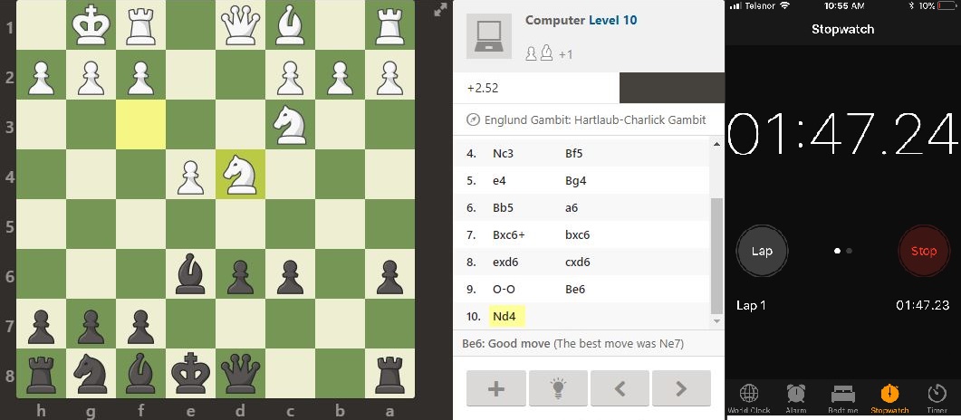 01:47, a ja još uvek nisam mrtav! Pa pogledajte, ostao sam bez konja i dva pešaka, ali to nije nikakav gubitak. Još sam se čvrsto držao.