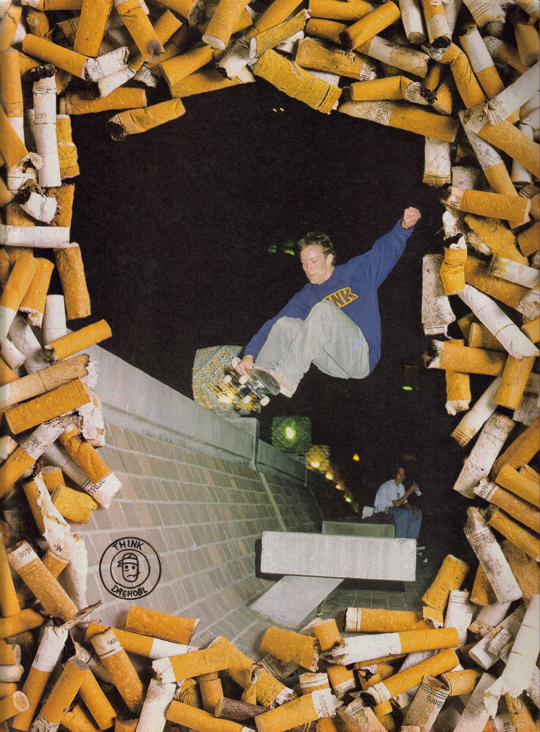 Ekstremni sportovi i nezdrav način života predstavljaju suprotne polove na skali rizika po zdravlje. Kod prvog, svaka povreda nastaje momentalno; kod drugog, šteta se akumuliše mnogo sporije, sa posledicama koje ostaju uspavane godinama. Dobra stvar u vezi sa aktivnošću kao što je BEJS skakanje jeste ta da, čim odlučite da ste završili sa skakanjem sa zgrada — pod pretpostavkom da se već usput niste povredili — ostajete zdravi kao da to nikad niste ni radili. Sa tim dijapazonom rizika na umu, kad vidim skejtera da izvodi neki trik pušeći cigaretu, ne mogu a da ne budem inspirisan njegovom čistom drskošću. Čak i da, kao što to radi Etijen Gendž u novom videu za Alltimers, skejter uspe da se dočeka na zemlji a da se na opeče ili završi s žarom u oku, on će i dalje osećati posledice decenijama kasnije u obliku emfizeme, srčanih bolesti i raznih drugih oblika raka. Kad smo već kod gledanja smrti u oči!Naravno, i skejtbording i pušenje tradicionalno se reklamiraju kao buntovne, prihvatljivo anti-socijalne aktivnosti. Pogledajte samo sve te skejterske grafike sa cigaretama. Ali, poslednjih godina stvari su se malo promenile. Svidelo se to vama ili ne, skejtbording će uskoro postati olimpijski sport, a broj dece koja puši na rekordno je niskom nivou. I tako, dok se krećemo ka tom zdravijem, vrlom novom svetu, izdvojimo trenutak da se osvrnemo na ugroženi trend pušenja tokom vožnje skejta.Da se razumemo: pušenje nije kul. “Where is the rebellion in acting like a fuck-up?/ Why not embrace simple health?” Peva Fil Elverum u “Don’t Smoke” Mount Eerie-a. S druge strane, ta pesma je jedino umetničko delo koje me je ikad navelo da poželim da ne pušim, za razliku od na hiljade fotografija, slika i filmova koji pušače predstavljaju u, ono, veoma kul svetlu. Prosto je: glamurozno je kad ljudi ne mare za bezbednost u potrazi za zadovoljstvom i nikakva zdravstvena upozorenja to neće promeniti. A opet, neki pušači izgledaju bolje od drugih. Fumeur pariska ulična eskapada Kevina Rordrigesa u novom videu Konversa Purple (na 10:39) funkcioniše zato što je on francuski buntovnik. Cigaretski okret Toma Penija, iz prvog Transworld videa, deo je baražne vatre legendarnih trikova skoka preko lanca na obali u San Dijegu. Ne znam je li Brendon Bibel (koji je neka vrsta američkog Toma Penija, kad malo bolje razmislite) i dalje navučen na cigarete, ali sa njegovim besprekornim stomačnim mišićima i atletskom opremom, cigareta bi tu totalno štrčala.Slično, ima nečeg neprijatno kod skejtera o kojima razmišljam kao o Tinejdž pušačima, posle istoimene fotografske knjige Eda Templtona. Maloletno pušenje jedna je od onih stvari koje izgledaju harizmatično samo ukoliko ste mlađi; inače kombinacija rančeva i tvrdih pakovanja prosto se ne slažu jedni s drugim. Vratolomije Bila Strobeka mogu da spadaju u ovu kategoriju. Kao i ovaj potez Artoa Sarija u Sorry. Artoova uloga u tom videu duga je čitave dve Bouvijeve pesme, obuhvata i kasne pubertetske godine i rane zrele godine, ali trik sa cigaretom čisto je tinejdžersko razmetanje. Prijatelj mora da ga zaustavi da ne uleti u saobraćaj, a Artoova glava trzne se tako da skoro prsne žar u lice drugara — nije baš kamelovski gladak potez.Uloga Endrjua Rejnoldsa u Stay Gold kulminacija je jedne karijere, poslednja prava demonstracija sile jednog od velikana svih vremena. Skoro je savršeno, narušeno samo preterano slatkastim indi saundtrekom, a tu nema nikakvog poziranja kada Bos pušeći izvede ono pred kraj. On se samo dočeka i podigne desnu ruku do usta. Rejnoldsovo “ludilo” pre ovog trika dobro je dokumentovano, a čovek stiče utisak da je odmarao s cigaretom između raznih pokušaja kad ga je iznenada obuzeo napad hrabrosti i nije želeo da sačeka da dovrši cigaretu, da ga samopouzdanje (ili kakva god emocija nagoni čoveka da skoči sa betona u visini očiju) ne napusti. Kadar se ne zadržava na cigareti već brzo prelazi na sledeći trik, ogroman lažni 360. Kladim se da bi Rejnolds, koji je transformisao sebe iz vodećeg Divljeg Pijanca u istinskog uzora, potpuno izbacio cigaretu da je mogao.Rane 2000-te predstavljale su na mnogo načina vrhunac pušenja i vožnje skejta. Bili su tu Piss Drunx, Arto Sari u Sorry i bomba sa lančane ograde Frenka Gervera. A tu je i, naravno, Enjoijev Bag of Suck, jedini skejt video koji je ikad započeo lekarskim upozorenjem o štetnosti duvana. Džeri Hsu iz vremena kad je koristio pertle umesto kaiša pali cigaretu zapaljenim palcem, Kasvel Beri izgleda kao činovnik čija pauza ne traje dovoljno dugo da odvojeno zdimi jednu i izvede ovo.Nešto skorija je njujorška noćna linija Pita Eldridža iz 2012. godine. U većini ovih spotova, skejterova cigareta ostaje u ruci (ili, ponekad, u ustima). Eldridžova je značajna po tome što on zapravo podigne ruku do usta, ubaci u njih cigaretu, zadrži je u usnama nekoliko sekundi, skloni, odradi svoju egzibiciju i konačno ispusti dim iz sebe. Kao što su Quartersnacks napisali u svom pregledu Najkuljih poteza u istoriji skejtbordinga, “Daleko od toga da je bio prvi koji je vozio skejt sa cigaretom, ali on je najbliži skejterskom ekvivalentu neke filmske zvezde iz četrdesetih koja puši u crno-belom filmu i izgleda neverovatno dobro dok to radi.”Nijedna analiza pušenja i vožnje skejta ne bi bila kompletna bez pominjanja Dena Drehobla, čoveka koji je pušenje tokom vožnje skejta pretvorio iz stilske egzibicije u način života. Drehobl je vozio decenijama, ali glavna stvar koju o njemu znaju skejteri određenog godišta jeste da u većini reklama ima pljugu u ustima — ponekad nekoliko. Drehobl i cigarete bili su toliko povezani da je 2003. godine, kad je profesionalni skejter i istaknuti hejter Tim O'Konor sastavio listu loših skejterskih trikova, broj šest bio “Vožnja skejta sa cigaretom u ustima ukoliko niste Dan Drehobl”: "Ovo je još jedan od onih slučajeva kad ljudi žele da se preds
