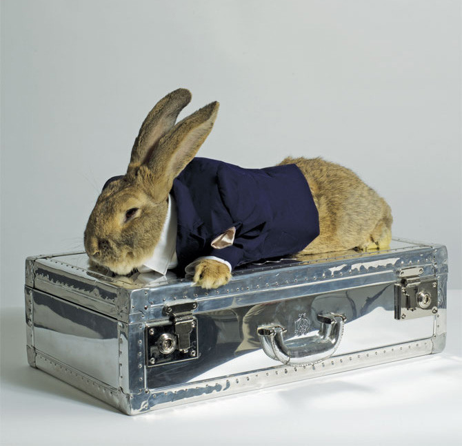 Stephen wears Look 1; Thumper rests in a Made in England Explorer Holdall