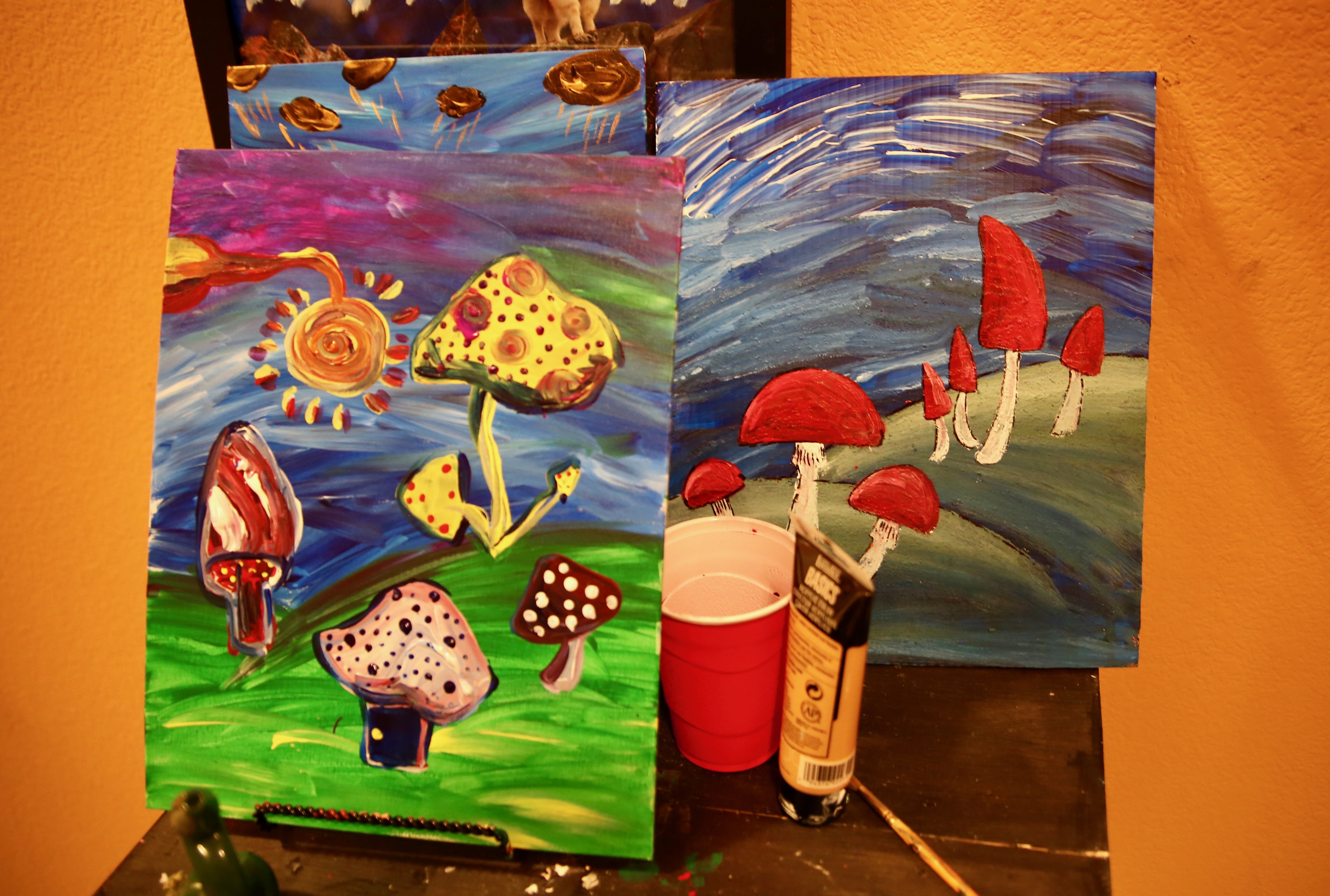 As class progressed, the uniqueness of each painting became more and more defined. Inhibition was discouraged by the hosts, and students were told to just go with their guts, resulting in some getting mega abstract and others abandoning the mushroom suggestion entirely in lieu of humans or tigers.