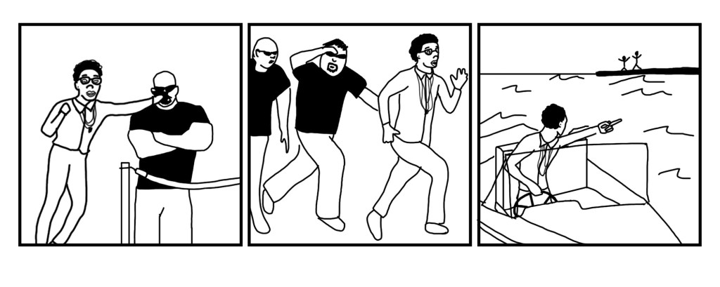 OK, so you know Rich Homie Quan he’s like a rapper, right, and last night he was in Miami, and he wanted to go to the Club LIV because it’s like the coolest club in Miami, and it’s where all the rappers hang out, and Drake has songs about it and stuff. So anyway he went to the club, but then he couldn’t get in, and the bouncer told him he’d have to wait in the regular people line, and according to TMZ he wasn’t a huge fan of that because he is a rich and famous rapper, so he was like “I’m gonna punch this bouncer” and everyone’s all “noooooo” and then he did and was like WHAAAM in the dude’s face and the dude’s like “ah ah my nose, my nose is broken and my lip is bleeding and I’m gonna get you Rich Homie Quan!” but it was like too late because Rich Homie Quan was already making his escape like ZOOOOM and everyone was like “how’s he going to get out of this one,” and well the answer is that Rich Homie Quan had a speedboat waiting, and he jumped in the speedboat and took off for a tropical island probably because he is Rich Homie Quan and he can just hang out and drink Piña Coladas in the Bahamas whenever he feels like it and stuff, and anyway the Coast Guard probably tried to catch him or something but he got away and the bouncer was like “gosh, foiled again!” and Rich Homie Quan was like “another W for the Quan-man!” because he is Rich Homie Quan and he is badass, baby, and if you wondered what it looked like well wonder no more because there is a comic of it right here.