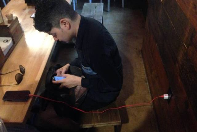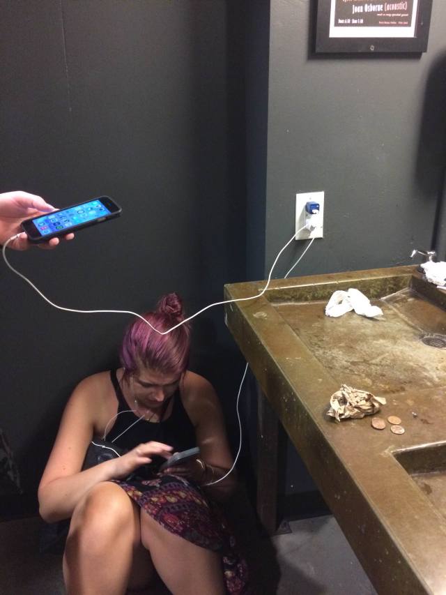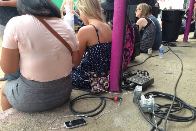 At South by Southwest, everything is scarce, and everything is coveted. Whether it's wristbands, open cabs (or Ubers not on 5x surge pricing), plus ones, or chances to hang out with famous people, there is something everyone is looking for that they just can't find. Nothing, though, is more valuable than a phone with full battery, which is why everywhere you went in Austin this week, you could see people plugged in, charging their phones. At shows, in the sound booth, in a sponsored charging station, by the fire extinguishers—you name it, anywhere there was an open outlet there was someone taking advantage of it to get their battery back out of the red. It's often said that you can't see everything at SXSW, and that's true. It would have been impossible to track down all the people charging their phones, but here is a survey of the best attempts we witnessed: